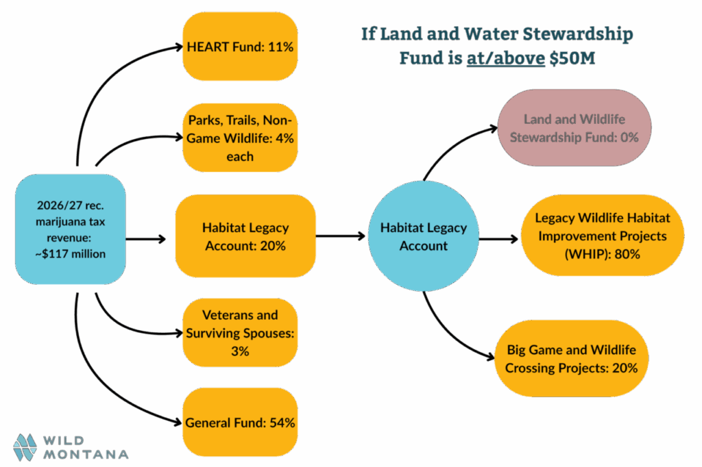 All sounds great! More money for access and conservation benefits all of us, and recreational marijuana is an exciting new source of revenue that we can use to invest in our outdoors. But wait, there’s more. If the Habitat Legacy Account’s (the three bullets listed directly above) balance reaches $50 million, then the Land and Wildlife Stewardship Fund doesn’t receive any more money until its balance is spent down below $50 million. Instead, 80% of the Habitat Legacy Account funding goes to the WHIP program and 20% to wildlife crossing initiatives.